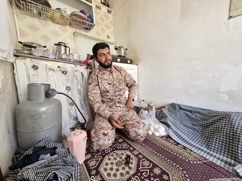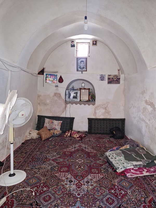 یک اتاقک را تخریب نکرده بودند تا وسایل را در آن بگذارند. چهار پتو و چند بالشت رنگی روی یک فرش پوسیده قرمز گذاشته شده؛ پرچم حضرت عباس، یک تلویزیون ۱۴ اینچ قدیمی و چند مهر در یک طاقچه؛ لباسهایی که جلوی آن یک پرده با کش زده شده در طاقچه دیگر و در کناری وسایل آشپزخانه گذاشته شده است.